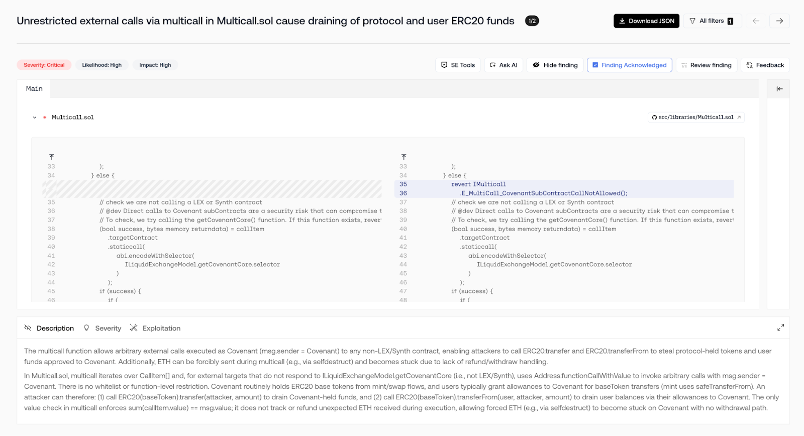 During a subsequent manual audit, Covenant ran Octane to review code changes before sending them back to the auditor. Octane uncovered a critical flaw in the way Covenant.sol both custodies base tokens and accrued protocol fees and inherits a permissive `Multicall`. By tracing execution with Covenant as `msg.sender`, Octane showed that an attacker could chain external calls across contracts with Covenant’s authority.