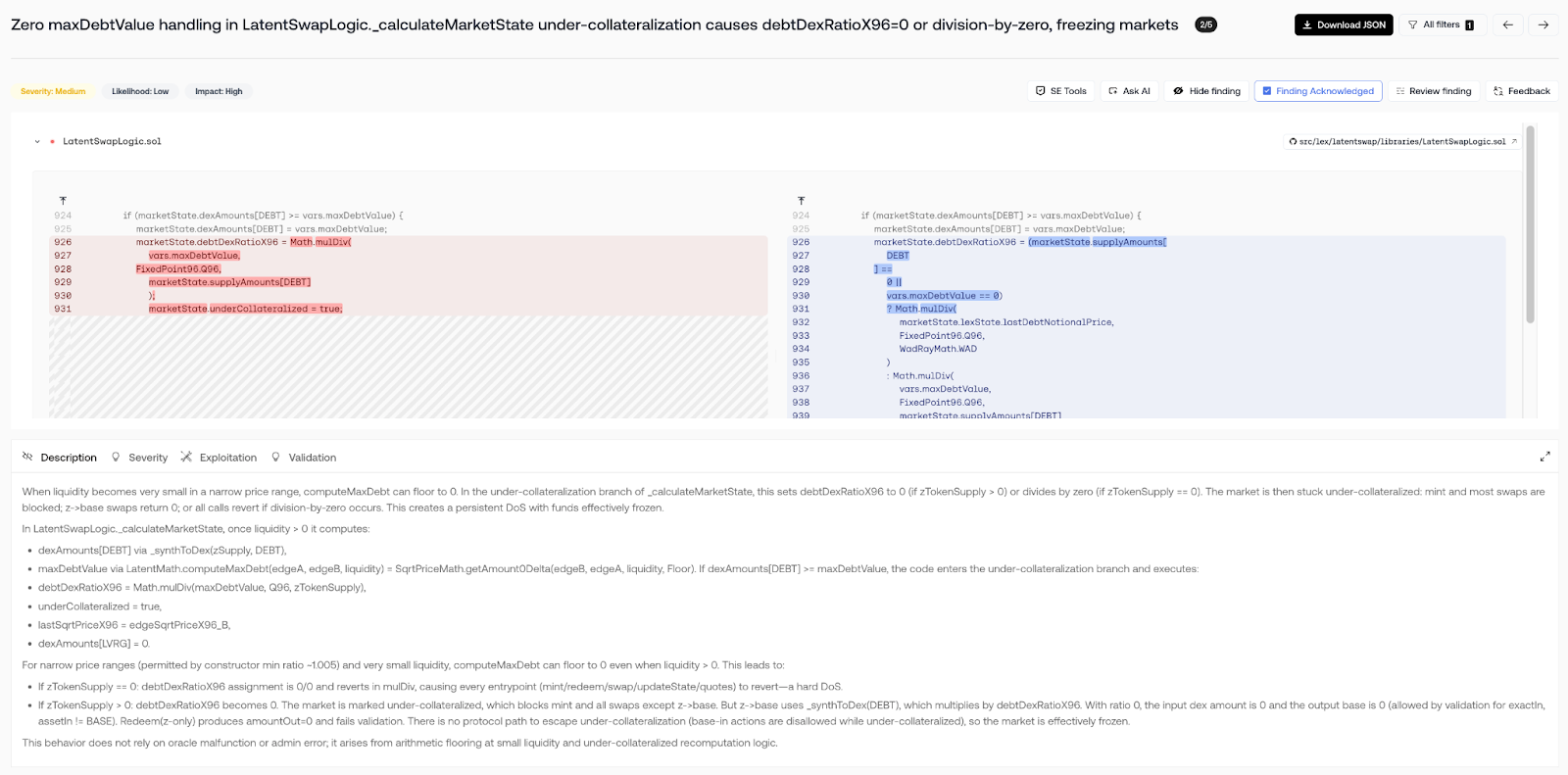 Bug: A zero-handling bug in `_calculateMarketState` could freeze a market. When liquidity is very low, `computeMaxDebt` can floor to 0, which either sets `debtDexRatioX96` to 0 or divides by zero. The market flips to under-collateralized and most actions block, effectively trapping funds.