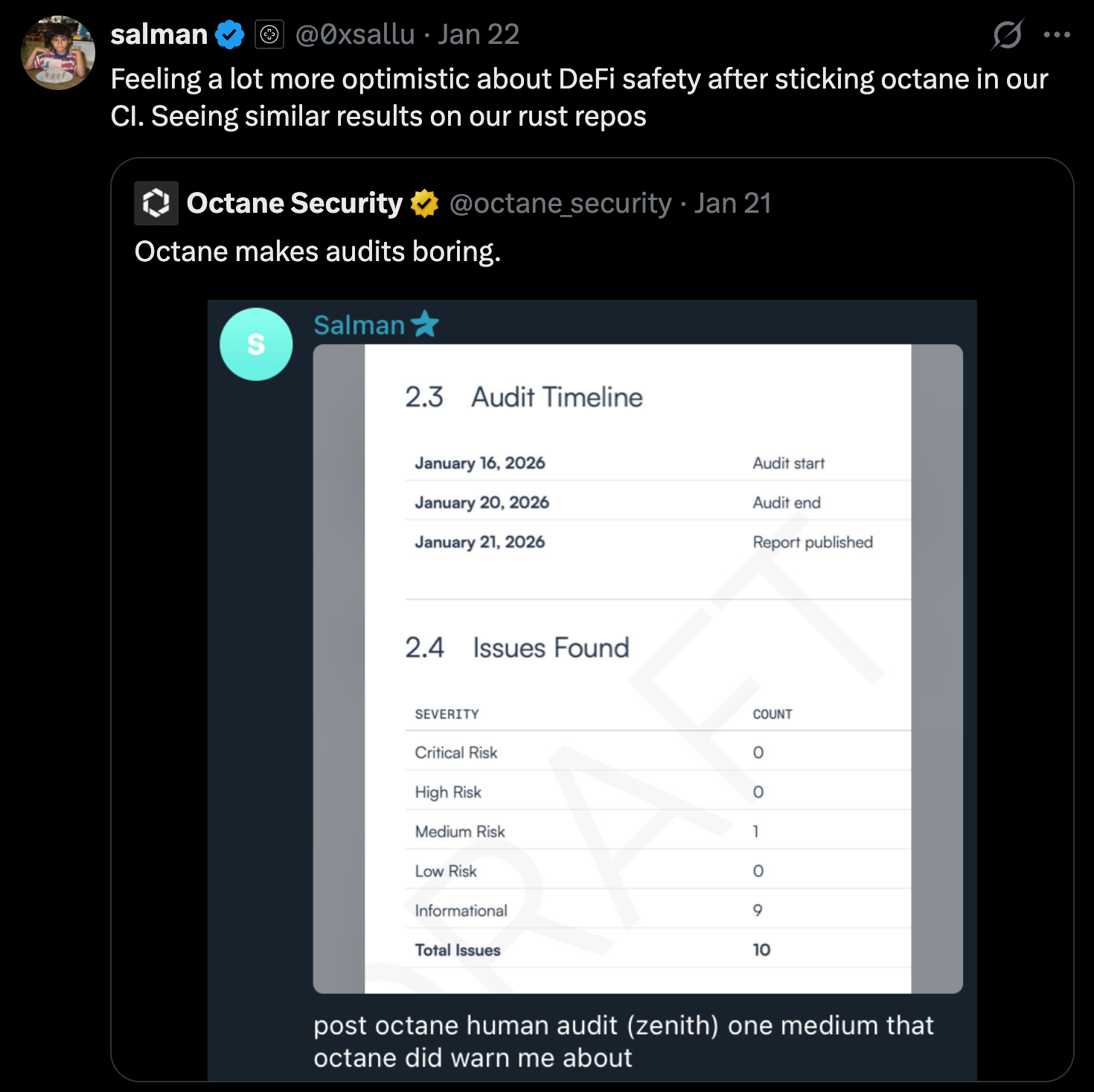 Auditors found no critical vulnerabilities, no high-severity issues, and only a single medium-severity finding, which Octane had already surfaced. Button sent cleaner code off for audit because Octane had already caught the meaningful risk during development.