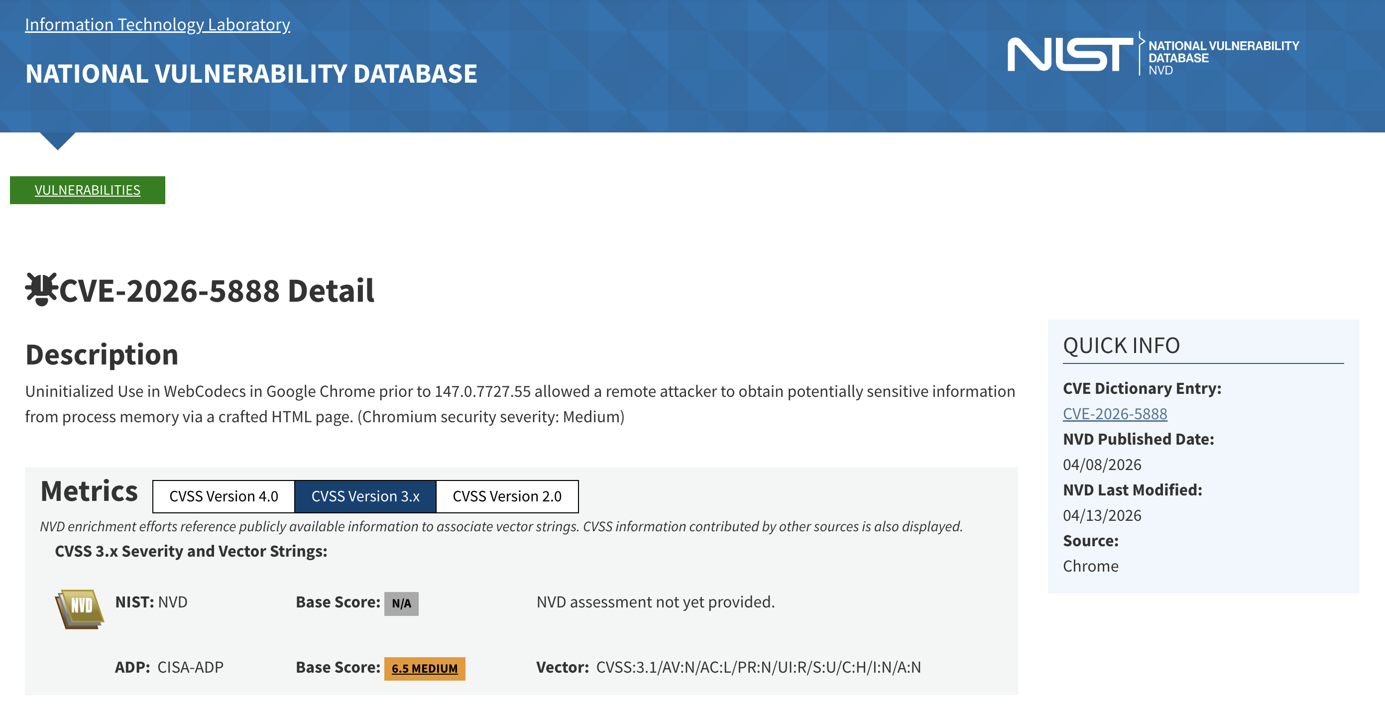 Chromium: CVE-2026-5888. Octane found a heap disclosure in WebCodecs, reachable through VideoFrame.copyTo(codedRect). A malicious page could request a pixel copy using a rectangle that exceeded the frame's legitimate bounds and receive, in return, uninitialized bytes from renderer memory that JavaScript was never intended to see. The bug was reported to Google's Bug Hunters Chrome Vulnerability Report Program, triaged at P2/S2, and is now fixed.