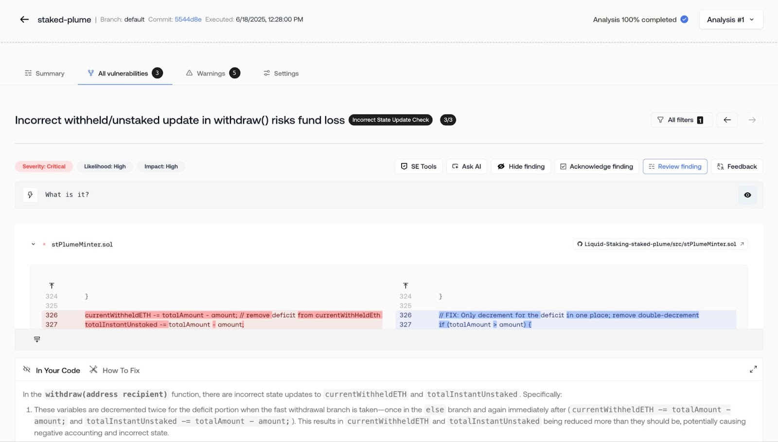 On an initial scan of major Plume protocols and core contracts, Octane analyzed more than 66,000 lines of code and delivered 192 findings in total. This included three separate scans of core Plume contracts, along with ecosystem companies like Mystic, where Octane uncovered a critical bug that could have led to loss of funds.