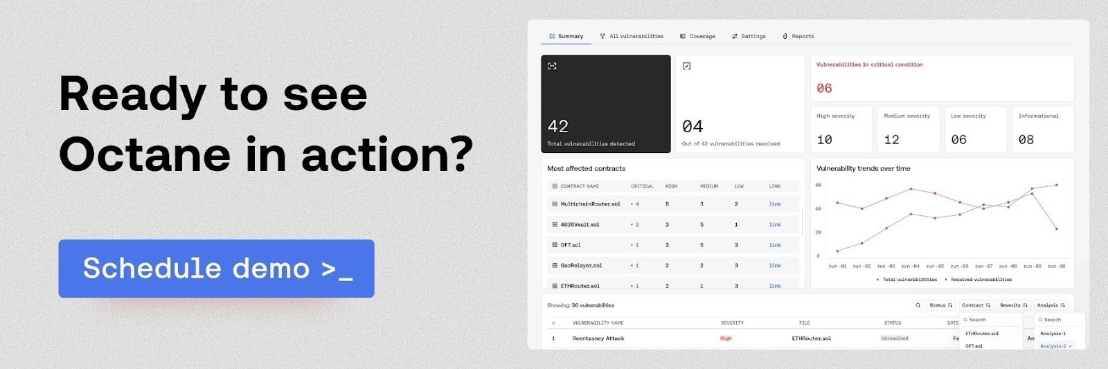 Octane’s goal is to make continuous, autonomous, developer-first security the new default for smart contracts. Every team that ships securely is one fewer opportunity for attackers and one step closer to a safer decentralized future.