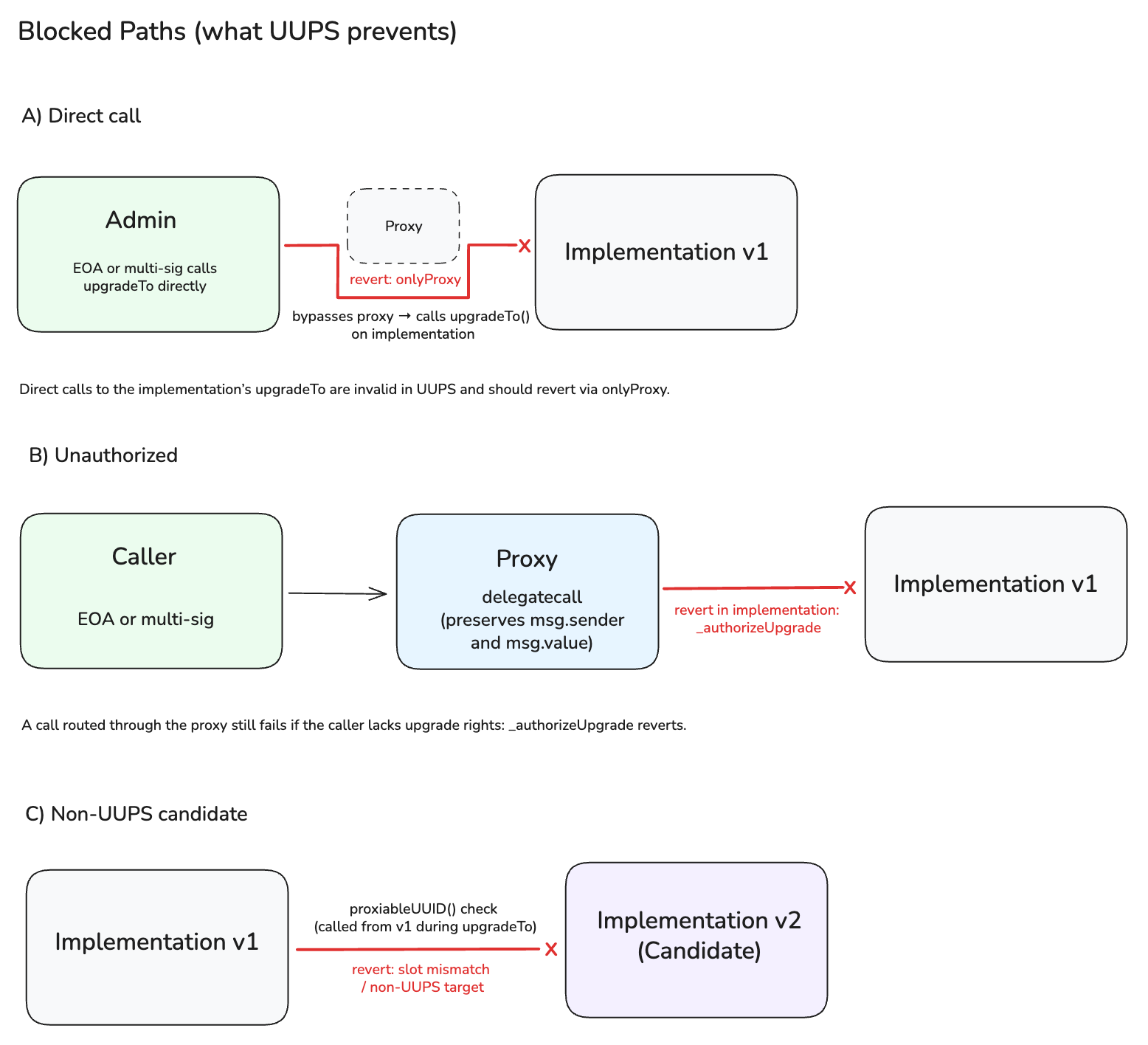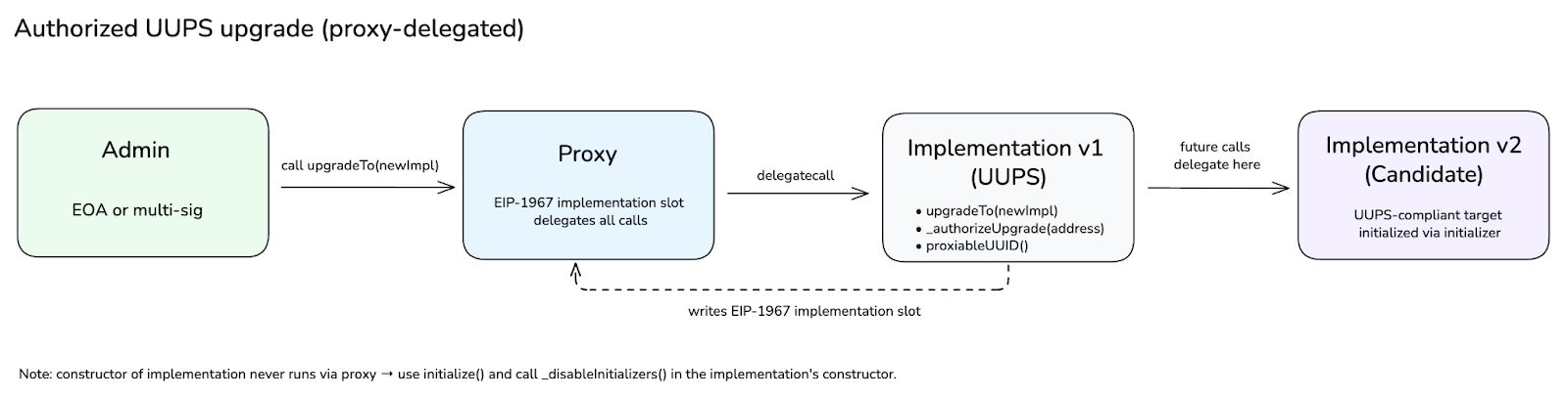upgradeTofunction (and usually an eventupgradeTo(address)and a proxiable UUID getter). The proxy is very minimal – it basically just delegates calls. The implementation’supgradeTotypically usesonlyProxy(a modifier that allows it to be called only via adelegatecall, i.e. only when invoked through a proxy) and an_authorizeUpgradefunction (usually to restrict access to an owner or admin) to control upgrades. - Failure modes. The most common UUPS mistake isn’t a direct call to
