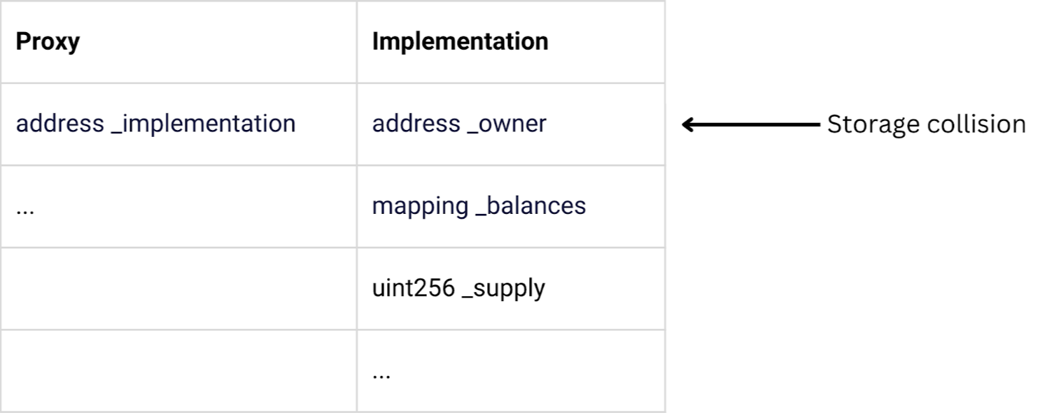 selfdestruct, permanently freezing ~$150 million in Ether. Always initialize your proxy (or implementation, in UUPS) as part of deployment, and call_disableInitializers()on the logic contract. - Storage layout collisions. If you change the order or type of state variables between upgrades (or introduce new stateful base contracts) you will shift storage slots and likely corrupt the contract’s state. The rule is append-only for storage: do not reorder existing variables, only add new ones to the end, and maintain a reserved