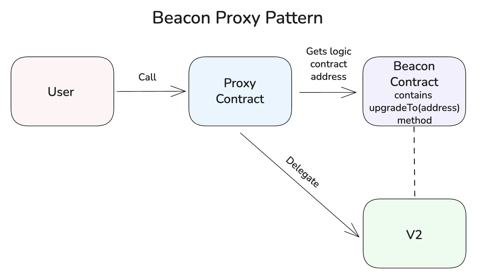 pgradeTo(address newImpl)plus an access control mechanism (_authorizeUpgrade) and a proxiable UUID for safety. This yields a slightly leaner proxy (no admin logic in the proxy) and allows the implementation to potentially lock or disable further upgrades. However, because the implementation governs its own upgrades, you must implement proper access control (e.g. restrictupgradeToto only be callable via a proxy, using anonlyProxymodifier) to prevent someone calling the implementation directly and bricking the upgrade path. - Beacon proxy: This pattern introduces a third component, a Beacon contract, which holds the address of the current implementation. Many proxy instances can point to the same Beacon. Upgrading the Beacon then updates the implementation for all its proxy dependents in one transaction. This trades granular control for scale – it’s efficient when you have numerous identical contract instances that should all upgrade together, but it also means a bad Beacon upgrade can break every proxy at once (a shared failure domain). Each
