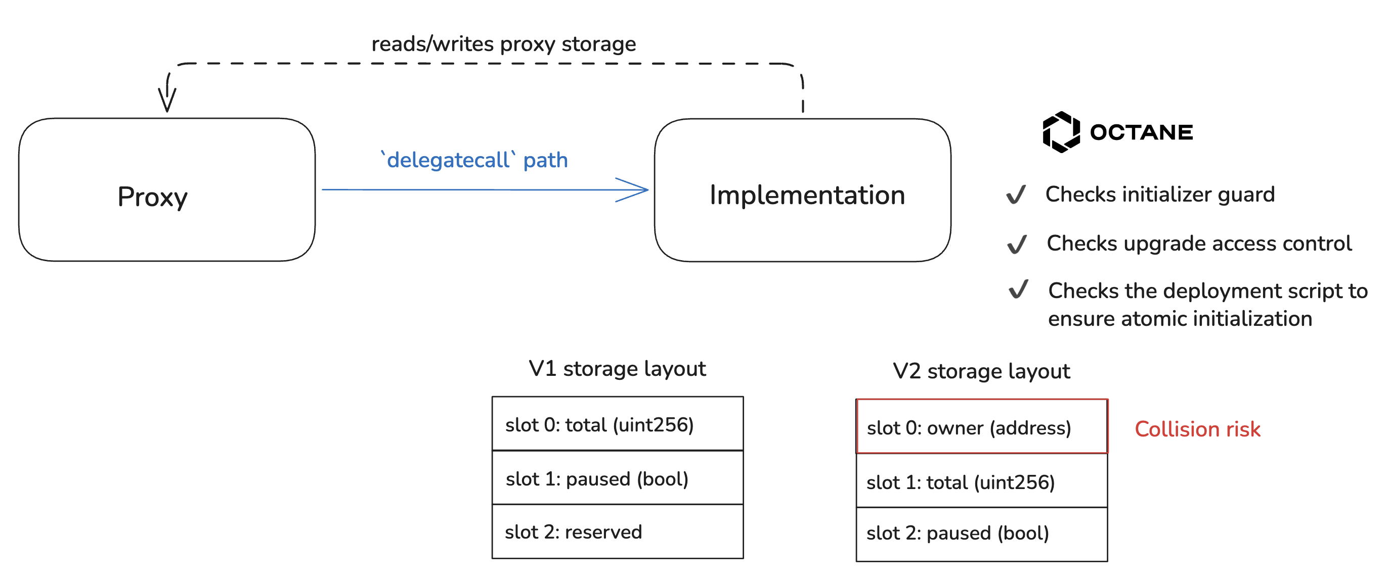 onlyProxymodifier on a UUPSupgradeTofunction, a smart tool can insert a default one. If you forgot to reserve storage with a__gapin a base/upgradeable contract, a tool could suggest adding it to reserve storage. Octane’s platform goes further – it can detect a missing parent initializer call or an unsafe storage change and directly propose a patch (diff) to fix it. Embracing such automated fixes in your CI can make the upgrade process much safer and faster.
