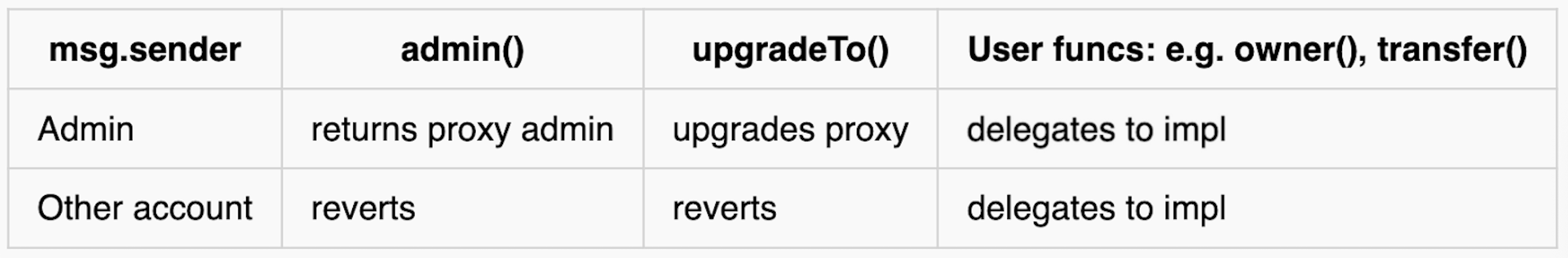 upgradeTo(and related) function. Only an admin (often via aProxyAdmincontract) can call upgrade functions; regular users never interact withupgradeTodirectly. The proxy’s logic is: if the caller is the admin, handle the call in the proxy (for upgrades or admin changes); otherwise, delegate everything to the implementation. This ensures admin and user call paths are separated cleanly. - Failure modes. An admin might accidentally interact with the contract in the wrong way – e.g. calling a function meant for users but from the admin address, which in a Transparent proxy pattern will not be delegated (because admin calls are intercepted by the proxy). Also, forgetting to initialize the separate