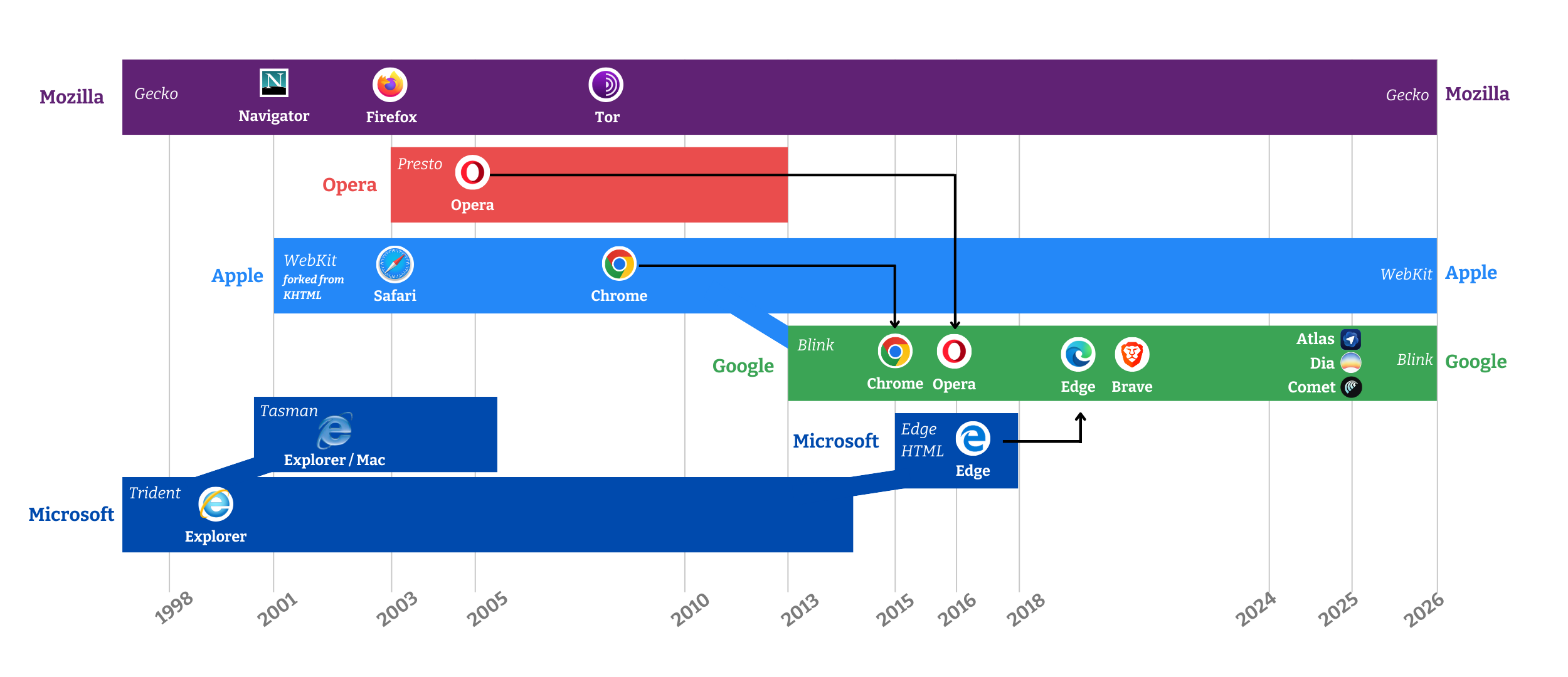 Three browser engines render nearly everything you see on the web. Blink powers Chrome, Edge, Brave, Opera, and all other Chromium-based browsers. Gecko powers Firefox. WebKit powers Safari, and under Apple’s platform rules it also underlies other browsers on iOS. Together, they account for 99.7% of global browser traffic. Much of the modern web, from banking and messaging to medical records, onchain wallets, and corporate infrastructure, depends on these three codebases stewarded by Google, Mozilla, and Apple.
